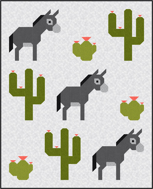 The fabrics are all from stash. The background is from Northcott Fabrics Ambience collection. The cactus plants and donkey fabrics, also Northcott Fabrics, are from the Toscana collection.