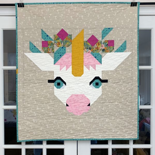 Hello lovely friends! I am so pleased with my Baby Unicorn quilt! Nose my way in here… The background print is Dandelion in Almond by Andover Fabrics. The backing is Oh, Woof! by Jessica Swift for Art Gallery Fabrics. What could be cuter than puppies and rainbows? It’s such a