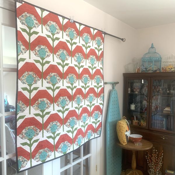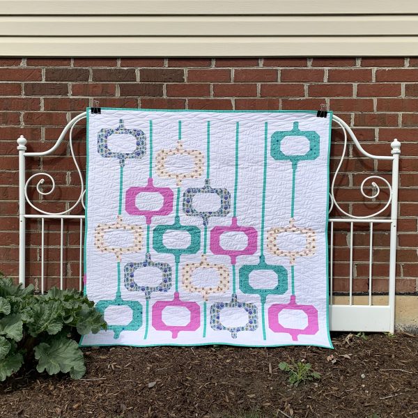 I’m back, baby! It’s been a while since I have gotten any quilting done. But now I’m on a roll! Quilted in white on top and variegated blue green on the back. Binding in black gives a handsome frame. I am digging everything about this design! Gotta love that POP!