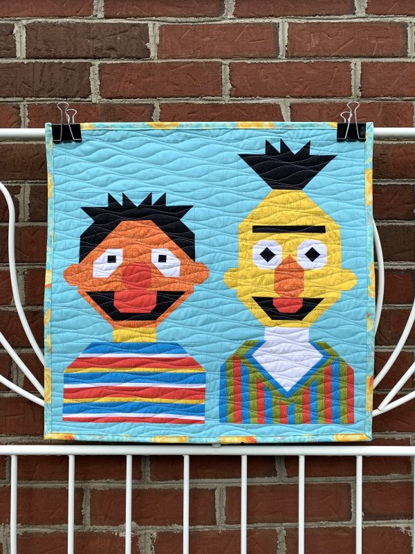 Today I’m sharing my Ernie and Bert wall hanging. This quilt was hung in my backyard on the old bed headboard I found roadside. Ernie requested rubber duckies for the backing. Quilted in my organic wavy lines! I added triangle corner pockets for easy hanging. My Ernie & Bert quilt