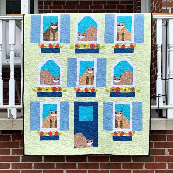 Welcome SPRING!!! It has been cool, damp and cloudy, but I consider it officially spring when I can post a photo of quilts hung outside without snow as a backdrop. This quilt features a house full of cats. One is really enough… My pre-quilting model was crying from the wrong