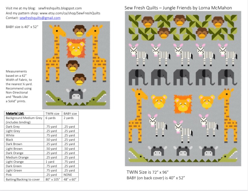 This pattern provides instructions for making the complete Jungle Friends quilt in both Twin and Baby sizes. Twin finishes at 72″ x 96″ and Baby finishes at 40″ x 52″