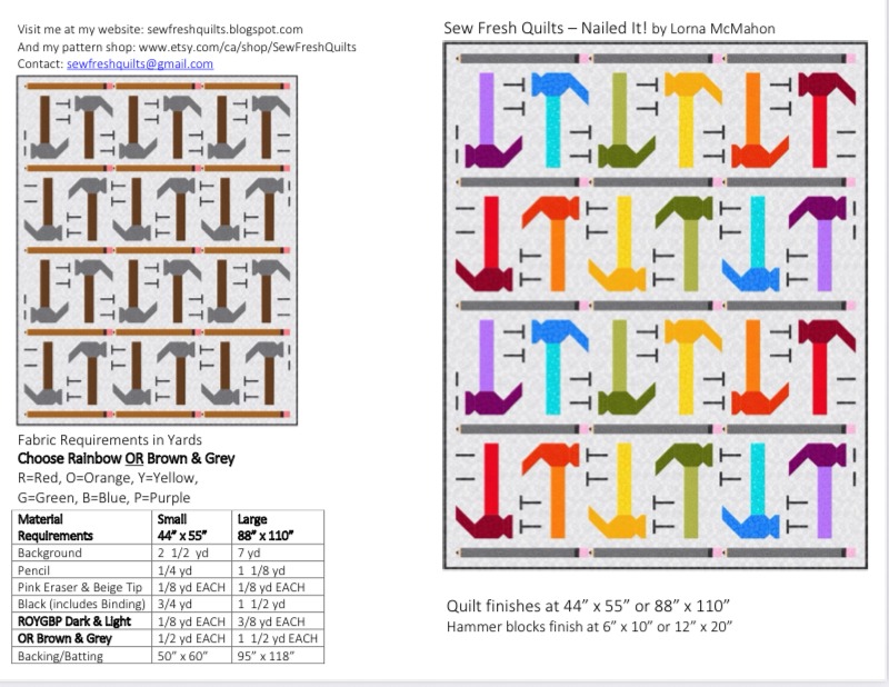 Nailed It quilt pattern provides instructions for finished sizes are 44″ x 55″ or 88″ x 110″. Hammer blocks finish at 6” x 10” or 12” x 20”. This quilt pattern comes with instructions for both the Rainbow setting or the grey and brown setting.