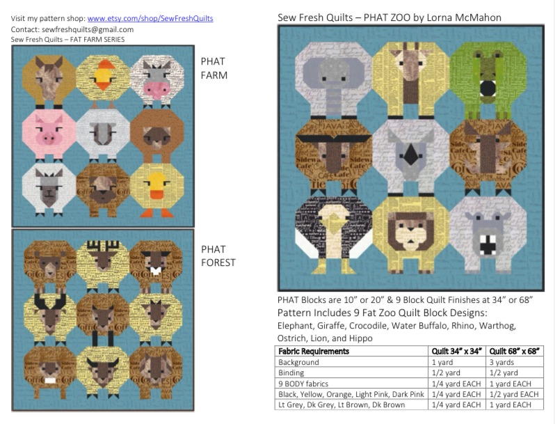 PHAT ZOO finished size is 34″ x 34″ or 68″ x 68″.